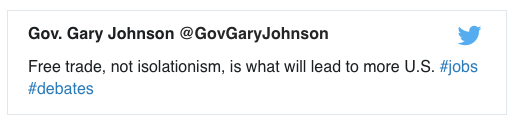 同一時間,新墨西哥州長Gary Johnson以及民主黨選民Gary Johnson對此作出反應(yīng),認(rèn)為自由貿(mào)易不應(yīng)該是孤立主義。