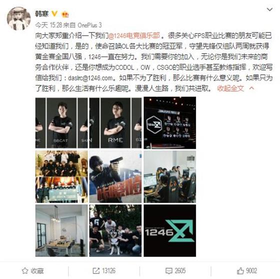 韓寒進(jìn)軍電競(jìng)組建1246