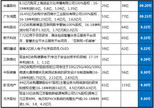 9月份主要選擇的公司停牌階段市值普遍較小、所涉及增發(fā)收購?fù)庋邮劫Y產(chǎn)行業(yè)主要有職業(yè)教育、精準(zhǔn)廣告、新能源材料、光通訊、新能源汽車產(chǎn)業(yè)鏈,主要篩選公告內(nèi)容如下